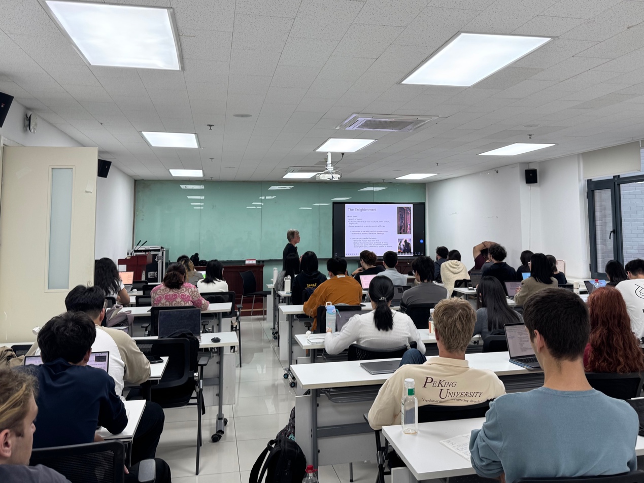 2025年10月14日至11月5日,北京大学马克思主义学院邀请爱尔兰都柏林城市大学名誉教授Helena Sheehan(海伦娜·希恩)讲授“马克思生平与思想研究引论”课程。来自马克思主义学院、外国语学院、新闻与传播学院、法学院等院系的众多本硕博学生积极参与课堂学习及相关活动,反响热烈。