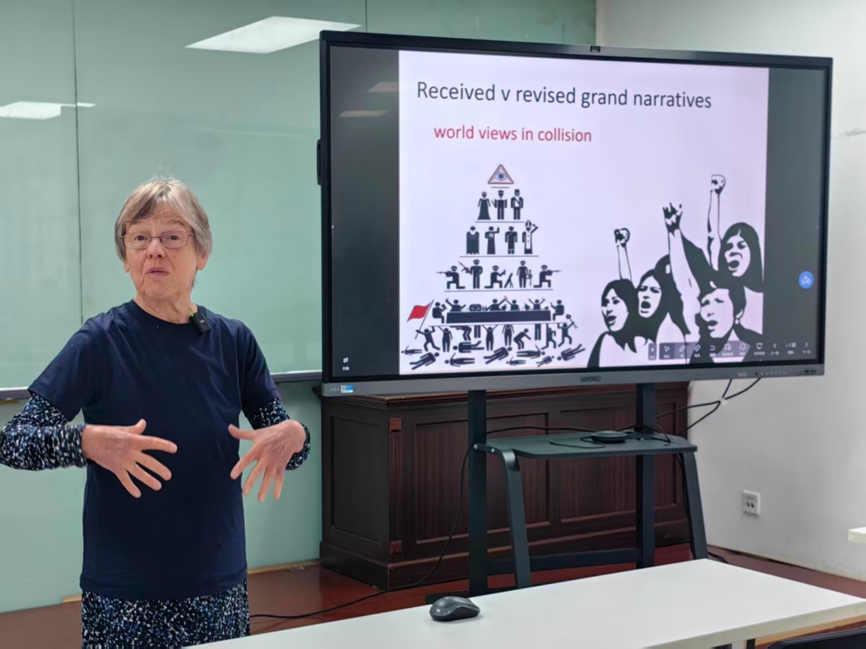 第四讲以“马克思主义与历史哲学”(Marxism and the Philosophy of History)为题,Sheehan教授回顾了历史哲学从提出、遭遇批判到当代回归的演变过程,并探讨了中国在宏大历史叙事中的角色。她指出,马克思主义的宏大叙事是特定时代的产物,以生产方式演进为核心的历史唯物主义有力回应了唯心主义史观,满足了时代的理论需求。20世纪90年代苏东剧变后,社会主义运动陷入低潮,后现代主义对宏大叙事发起猛烈批判,Sheehan教授认为这些批判实际上反映了晚期资本主义中物质与心理的错位,同时也呼唤着宏大叙事的回归。她提及福山与詹姆逊等西方右翼与左翼学者对宏大叙事复兴的探讨,强调在当前背景下系统思考历史叙事的必要性。她进一步指出,中国在当代历史叙事复兴中扮演重要角色,通过积极构建全球秩序替代方案、探索社会主义发展道路,为全球秩序发挥了稳定作用。